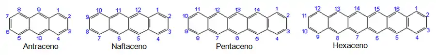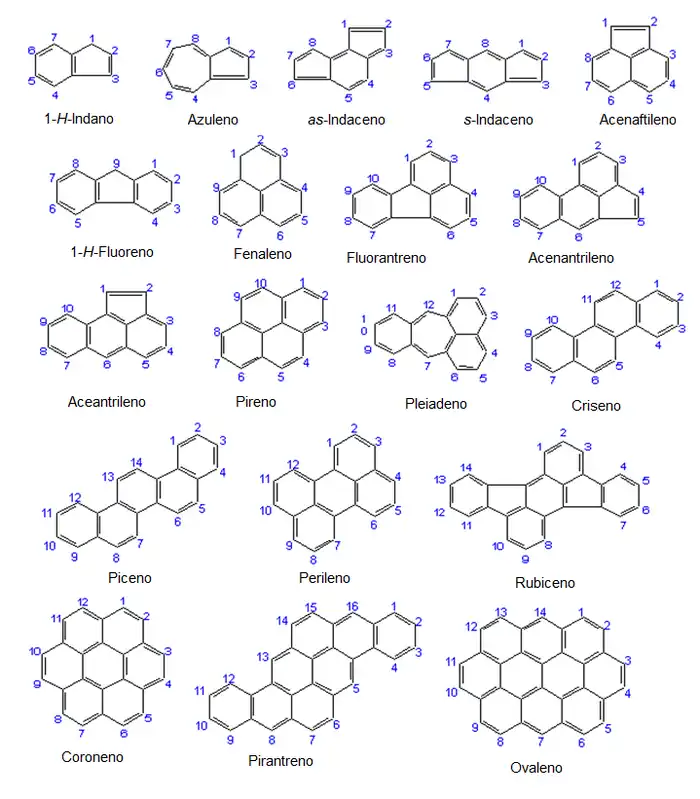Pentaleno – Indeno – Naftaleno – Azuleno – Heptaleno - Bifenileno - s-Indacene - as-Indaceno – Acenaftileno - Fluoreno - Fenaleno – Fenantreno - Antraceno – Fluoranteno - Acefenantrileno – Aceantrileno - Trifenileno - Pireno – Criseno – Tetraceno - Pleiadeno - Piceno - Perileno - Pentafeno - Pentaceno - Tetrafenileno - Hexafeno - Hexaceno - Rubiceno - Coroneno - Trinaftileno - Heptafeno - Heptaceno - Pirantreno - Ovaleno
