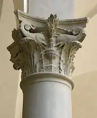 En el vestíbulo hay un escudo de armas con dos delfines simétricos al exterior, atribuidos a Donatello. Datan de principios del siglo XV y estaban en la parte superior del antiguo Jardín de los Pazzi, en la via dell'Oriuolo, en el sitio que actualmente ocupa el Palacio del Banco de Italia, más tarde se trasladaron a la esquina de este edificio y al ser recientemente restaurados se trasladaron al vestíbulo por razones de conservación.