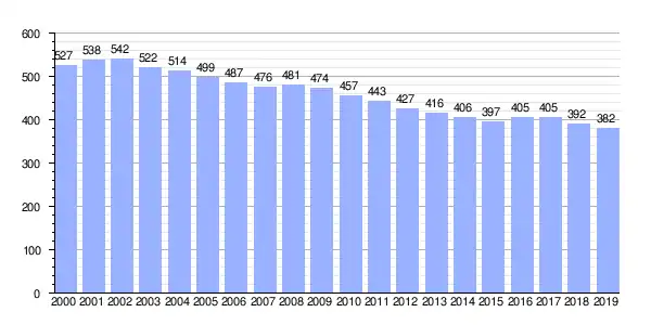 | Gráfica de evolución demográfica de Pazos entre 2000 y 2019 |