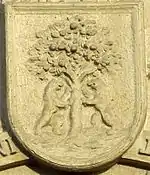 En campo de oro, un pino con piñas de oro, acompañado de dos lobos empinados al mismo y de dos pizarras al pie del tronco.[1]