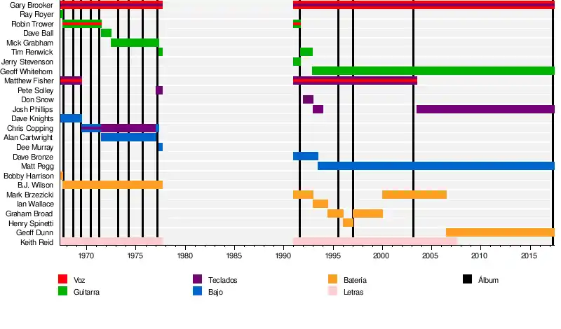 - Gary Brooker – voz, piano (1967–1977, 1991–2017; fue el único miembro de cada etapa del grupo, hasta su fallecimiento en 2022)