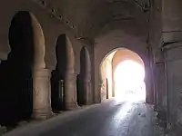 En el interior, el paso de la puerta es curvo, gira 90 grados dos veces,[9] y salva la distancia entre las dobles murallas de la Qasba, dando acceso a la plaza de Lalla Aouda más allá.