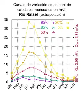 El caudal del río (en un lugar fijo) varía en el tiempo, por lo que existen varias formas de representarlo. Una de ellas son las curvas de variación estacional que, tras largos periodos de mediciones, predicen estadísticamente el caudal mínimo que lleva el río con una probabilidad dada, llamada probabilidad de excedencia. La curva de color rojo ocre (con ) muestra los caudales mensuales con probabilidad de excedencia de un 50%. Esto quiere decir que ese mes se han medido igual cantidad de caudales mayores que caudales menores a esa cantidad. Eso es la mediana (estadística), que se denota Qe, de la serie de caudales de ese mes. La media (estadística) es el promedio matemático de los caudales de ese mes y se denota .