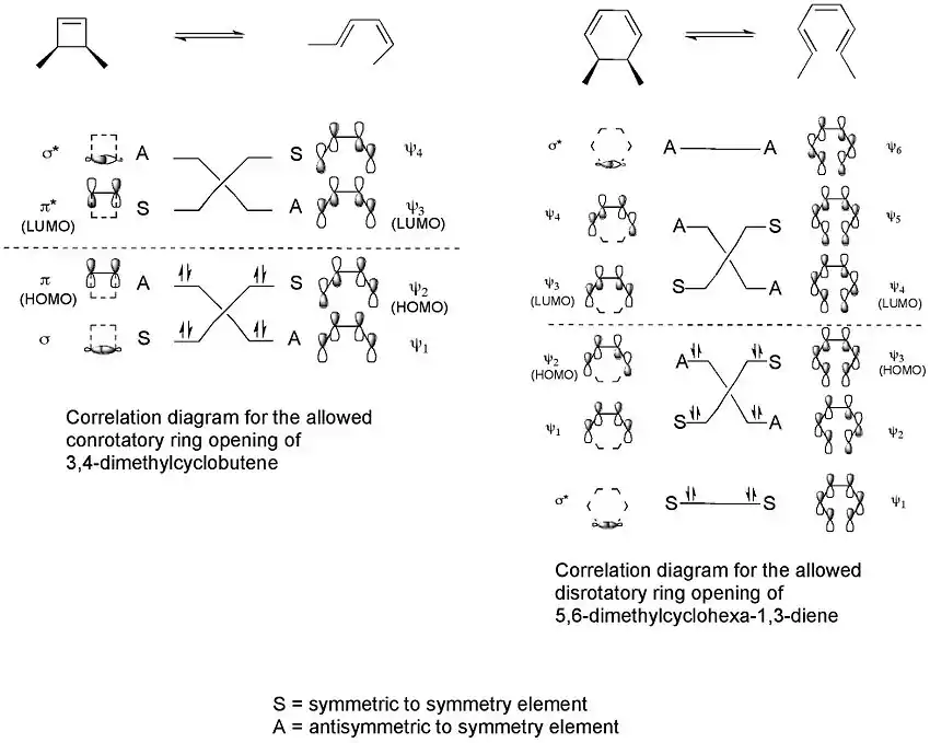 Estos diagramas de correlación indican que sólo una apertura de anillo conrotatoria del 3,4-dimetilciclobuteno está permitido por la simetría, mientras que sólo una apertura de anillo disrotatoria está permitida por la simetría. Esto se debe a que sólo en estos casos puede darse el máximo traslape de orbitales en el estado de transición. Asimismo, el producto formado estaría en el estado fundamental, en vez de un estado excitado.