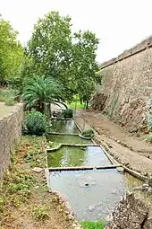 Lienzo del baluarte, murallas viejas y, en el medio, el foso.