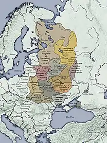 El establecimiento de los primeros estados eslavos orientales en el siglo IX coincidió con la llegada de los varegos, los vikingos que se aventuraron a lo largo de las vías fluviales que se extendían desde el Báltico oriental hasta los mares Negro y Caspio.[47] Según la Crónica Primaria, un varego del pueblo Rus, llamado Rúrik, fue elegido gobernante de Nóvgorod en 862. En 882, su sucesor Oleg se aventuró al sur y conquistó Kiev, que anteriormente había estado pagando tributo a los jázaros.[41] Posteriormente, el hijo de Rúrik, Ígor, y el hijo de Ígor, Sviatoslav, sometieron a todas las tribus eslavas orientales locales al dominio de Kiev, destruyeron el jaganato jázaro y lanzaron varias expediciones militares a Bizancio y Persia.[48][49][50]