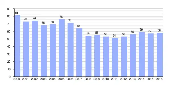 | Gráfica de evolución demográfica de Santibáñez de Ordás[3] entre 2000 y 2016 |