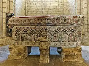 En los laterales del arca sepulcral, varios relieves muestran el sepelio de la difunta, tal y cómo se realizaba en aquella época y, al igual que el sepulcro del infante Felipe, descansa sobre águilas y leones que actúan a modo de pedestales.[33] Ricardo del Arco y Garay, por su parte, proporcionó la siguiente descripción del arca sepulcral, aunque erró al identificar a la difunta con la tercera esposa del infante, Leonor Rodríguez de Castro:[42]