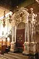 A la "majestuosa" bimah se llega mediante un tramo curvo de ocho escalones a cada lado. Tiene un dosel octogonal sostenido por cuatro columnas y cuatro pilares (dos sobresalen de la pared). Los capiteles corintios de las columnas y pilares son dorados. Elaborados tallados barrocos coronan el dosel.[1]
