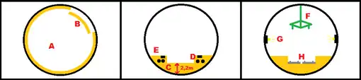 - Fase 2: relleno de la base del túnel con hormigón (C), construcción e instalación de las canalizaciones ferroviarias (D)[Nota 3] y construcción de los pasillos laterales para el movimiento y evacuación de personas (E).