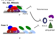 - Aunque en principio se creía que el complejo CTS y el basado en POT1 eran incompatibles, existen proteínas asociadas a telómeros en S. cerevisiae similares a la Shelterina, estas son Rif1, Rif2 y Rap1. Aparentemente, realizan las mismas funciones de inhibir la fusión de telómeros por NHEJ y la elongación por la telomerasa, así como el procesamiento nucleolítico de los telómeros en las fases del ciclo celular G1 y G2, es decir, la formación del saliente 3'.[59]