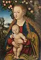 - Leonardo da Vinci pintó varias Vírgenes con Niño, como la Madonna Dreyfus (1475-1480), la Madona Benois (1478-1482), La Virgen de las Rocas (1483-1486) o la Madonna Litta (1490-1491). Sus discípulos, los llamados leonardeschi, encontraron en el tema de la Madonna un vehículo muy apropiado para la reproducción de los rasgos más conspicuos del estilo y la técnica de su maestro (los rostros amables y sonrientes, las formas suaves, el sfumato, la composición dinámica pero equilibrada), como en la Madonna del rosal, de Bernardino Luini (1510).[38]