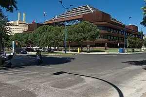 Con una forma que recuerda a una gran pirámide, consta de dos partes muy diferenciadas: una inferior revestida de planchas metálicas con un acentuado color rojizo donde se distribuyen las distintas dependencias y núcleos de trabajo del edificio, y la otra superior formada por la cúspide de la pirámide, escalonada y completamente acristalada para dotar de luz natural a la zona ajardinada que se plantea en su interior.