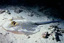 Este ejemplar de Raya del arrecife vive en las grandes profundidades y es característico de la zona demersal.