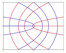 En estas figuras, las curvas rojas son las líneas de curvatura de una familia de direcciones principales y las curvas azules de la otra.