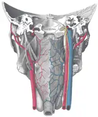 ![]() Esquema de las ramas de la arteria maxilar. La carótida externa está señalada abajo a la izquierda. | ||