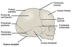 ![]() Cráneo de un recién nacido. Son visibles las suturas entre los huesos del cráneo que corresponden a una articulación de tipo sinartrosis con nula movilidad. | ||