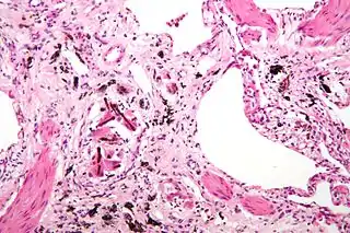 ![]() Micrografía de asbestosis que muestra los cuerpos ferruginosos característicos y marcada fibrosis intersticial (o cicatrización). Tinción hematoxilina-eosina. | ||