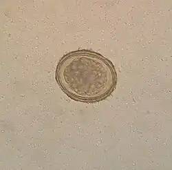 Los huevos fértiles de Ascaris lumbricoides tienen forma oval o redonda, con una cubierta protectora formada por tres capas (una interna vitelina, una media transparente y una externa mamelonada-albuminoide) y en el interior una masa granular de donde se originará la larva.[7]