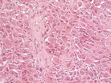 Histológicamente, son características de la lesión las células gigantes astrocíticas; sin embargo, la morfología de las células tumorales puede variar desde células poligonales con citoplasma vítreo y núcleos ganglioides hasta células fusiformes en una matriz fibrilar. Las células tumorales muestran una expresión variable de GFAP, S-100, sinaptofisina y neurofilamentos.
