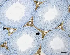 Células de Leydig en marrón (flecha).