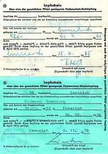 Certificado de vacunación contra la viruela, para la cual estuvo en vigor una vacunación obligatoria en Alemania desde 1967 hasta 1976