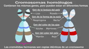 En los humanos, los 22 pares de cromosomas autosómicos homólogos contienen los mismos genes, pero codifican rasgos diferentes en sus formas alélicas, ya que uno se heredó de la madre y otro del padre.[12]