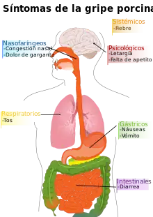 Los animales pasan por un cuadro respiratorio caracterizado por tos, estornudos, temperatura basal elevada, descargas nasales, letargia, dificultades respiratorias (frecuencia de respiración elevada además de respiración bucal) y apetito reducido. En algunos casos pueden producirse abortos en hembras grávidas. La excreción nasal del virus puede aparecer aproximadamente a las 24 horas de la infección. Las tasas de morbilidad son altas y pueden llegar al 100 por ciento, aunque la mortalidad es bastante baja y la mayor parte de los cerdos se recuperan tras unos 5 o 7 días tras la aparición de los síntomas.[18] Sin embargo, la exacerbación de la enfermedad puede producir pérdida de peso y deficiencias en el crecimiento, causando pérdidas económicas a los criadores,[19] ya que los cerdos infectados pueden perder hasta 5.5 kilogramos de peso en un periodo de 3 a 4 semanas.[19]