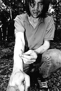 - Intravenosa - Inyección; la dosis de la droga se disuelve en agua y se hierve para la esterilización y una disolución mejor. La heroína suele ser introducida en las venas superficiales de las extremidades, pero se pueden introducir en cualquiera de las venas, como en los consumidores de drogas que suelen tener grandes daños a las venas.[69]