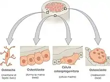 En el tejido óseo maduro y en desarrollo, se pueden diferenciar cuatro tipos de células: osteoprogenitoras, osteoblastos, osteocitos y osteoclastos. Los tres primeros son estadios funcionales de un único tipo celular.[8]