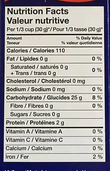 La etiqueta comienza con una medida de porción estándar, las calorías se enumeran en segundo lugar, y luego se presenta un desglose de los elementos constitutivos, incluido el % de valor diario (%DV).[28] Siempre se enumeran grasas totales, sodio, carbohidratos y proteínas; los otros nutrientes que generalmente se muestran pueden suprimirse, si son cero.[29] Por lo general, se muestran los 15 nutrientes: calorías, calorías provenientes de grasas, grasas saturadas, grasas trans, colesterol, sodio, carbohidratos, fibra dietética, azúcares, proteínas, vitamina A, vitamina C, calcio y hierro.