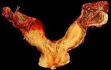 El riesgo de cáncer no aumenta en un útero bicorne. Los cáncer de endometrios son muy raros. Si aún no se conoce la presencia de un útero bicorne y existe la sospecha clínica de un carcinoma, pero no se puede confirmar por los histología los hallazgos, la ecografía y la resonancia magnética ofrecen posibilidades diagnósticas, ya que la causa puede residir en un segundo cuerno uterino.[6][7][8][9][10] Aproximadamente el 15% de todos los tumores de ovario y entre el 8% y el 10% de los tumores epiteliales de ovario son adenomas quísticos mucinosos (foto, derecha), que pueden surgir incluso en un útero normalmente desarrollado.[11]