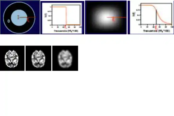 Este filtro efectúa un filtrado paso-baja cuyo grado de filtrado se controla por el radio del círculo. Un filtro muy abrupto puede producir oscilaciones en la imagen (fenómeno de Gibbs) por lo que suelen emplearse filtros paso-baja como el indicado a la derecha, que tienen una variación más suave. Son filtros con valores altos en el origen y que se atenúan hacia altas frecuencias.