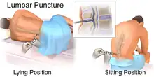 La meningitis puede sospecharse por los síntomas, pero se diagnostica con un procedimiento médico llamado punción lumbar,[46][47] que consiste en la inserción de una aguja especial dentro de la columna vertebral para extraer una muestra del líquido cefalorraquídeo que rodea el cerebro y la médula espinal.[48]