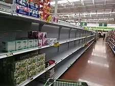 Algunos efectos que ha tenido la pandemia en México incluyen la generación de compras de pánico y saqueos de establecimientos, que a su vez han conducido al eventual desabasto de productos de limpieza e higiene personal,[11][12] la suspensión de eventos socioculturales,[13][14] el cierre temporal o definitivo de empresas,[15][16][17] y la caída del precio del combustible así como del peso mexicano en los mercados de divisas internacionales.[18][19]