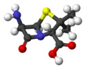 Las penicilinas pertenecen a una familia de compuestos químicos con una estructura química peculiar que le confiere una actividad característica contra un grupo determinado de bacterias.[17] A pesar de que existen diferentes variantes, la estructura química esencial de la penicilina fue descubierta por Dorothy Crowfoot Hodgkin entre 1942 y 1945.[36] La mayoría de las penicilinas poseen como núcleo químico el anillo 6-aminopenicilánico y difieren entre sí según la cadena lateral anclada a su grupo amino. Este núcleo 6-aminopenicilánico o núcleo penam consta, a su vez, de un anillo tiazolidínico (un anillo aminofenílico de los tiazoles) enlazado a un anillo β-lactámico;[37] este último, aparentemente esencial para la actividad antimicrobiana del compuesto,[38] es hidrolizado mediante penicilinasas (enzimas tipo β-lactamasas) por las bacterias resistentes a penicilinas.[1]