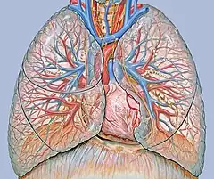 ![]() Disposición de los pulmones en el tórax, en el centro el corazón y los grandes vasos. | ||
