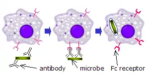 Cuando las moléculas de IgG, específicas para un determinado antígeno o componente de superficie, se unen al patógeno con su región Fab (región de unión al antígeno del fragmento), sus regiones Fc apuntan hacia afuera, en el alcance directo de los fagocitos. Los fagocitos se unen a esas regiones Fc con sus receptores Fc.[21] Se forman muchas interacciones de baja afinidad entre el receptor y el anticuerpo que trabajan juntos para unirse estrechamente al microbio recubierto de anticuerpo. La baja afinidad individual evita que los receptores Fc se unan a los anticuerpos en ausencia de antígeno y, por lo tanto, reduce la posibilidad de activación de las células inmunitarias en ausencia de infección. Esto también evita la aglutinación (coagulación) de los fagocitos por el anticuerpo cuando no hay antígeno. Una vez que se ha unido un patógeno, las interacciones entre la región Fc del anticuerpo y los receptores Fc del fagocito dan como resultado el inicio de la fagocitosis. El patógeno es engullido por el fagocito mediante un proceso activo que implica la unión y liberación del complejo región Fc/receptor Fc, hasta que la membrana celular del fagocito encierra completamente al patógeno.[29]