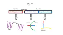 La toxina tetánica o TeNT se compone de una cadena pesada (100 kDa) y una cadena ligera (50 kDa) unidas por un enlace disulfuro. La cadena pesada es responsable de la unión neuroespecífica de TeNT a la membrana terminal nerviosa, la endocitosis de la toxina, y la translocación de la cadena ligera en el citosol celular. La cadena ligera tiene una actividad endopeptidasa dependiente de cinc o metaloproteinasa matriz (MMP) responsable de la escisión de la sinaptobrevina.[37]