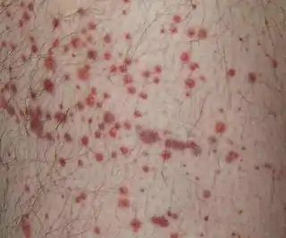 Un exantema[1] (del latín tardío exanthēma y este del griego exánthēma; significa 'eflorescencia')[2] o erupción cutánea (conocido coloquialmente como sarpullido) es una aparición brusca y diseminada sobre la piel de lesiones de morfología, extensión y distribución variable que aparece como manifestación clínica de una enfermedad sistémica de etiología diversa.