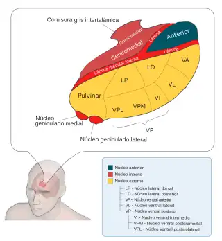 Los núcleos del tálamo pueden dividirse en cuatro regiones principales, cada una de los cuales está formada por uno o varios núcleos de neuronas:[1]