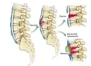 - Tuberculosis osteoarticular. Puede afectar a la columna dorsal y lumbar, lo que da lugar a la espondilitis tuberculosa o mal de Pott. También puede localizarse en otras articulaciones, sobre todo la cadera y la rodilla.[1]