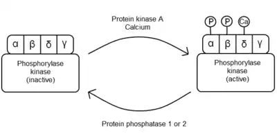 En general, la enzima está regulada alostéricamente y por fosforilación reversible. Las hormonas, los impulsos nerviosos y la contracción del músculo estimulan la liberación de iones calcio. Estos actúan como activadores alostéricos, uniéndose a las subunidades δ de la fosforilasa cinasa y activando parcialmente la actividad enzimática. Esta unión estabiliza parcialmente la proteína en la forma activa. La fosforilasa cinasa está completamente activada cuando las subunidades α y β son fosforiladas por la proteína cinasa A y la subunidad δ está unida a iones calcio.[5][10][23]