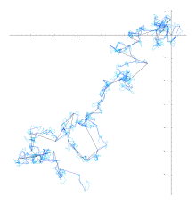 | Modelo del movimiento browniano de la trayectoria de una partícula de color en el agua. |