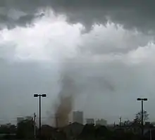 Un tornado se define en el Glossary of Meteorology como «una columna de aire que gira violentamente sobre sí misma, estando en contacto con el suelo, ya sea colgando de o debajo de una nube cumuliforme, y frecuentemente (pero no siempre) visible como una nube embudo...».[13] En la práctica, para que un vórtice sea clasificado como un tornado, debe tener contacto tanto con el suelo como con la base de la nube. Sin embargo, los científicos aún no han formulado una definición completa del término; por ejemplo, hay desacuerdos respecto a si múltiples puntos de contacto con el suelo provenientes del mismo embudo constituyen diferentes tornados.[14] El término «tornado» se refiere además al vórtice de viento, no a la nube de condensación.[15][16]